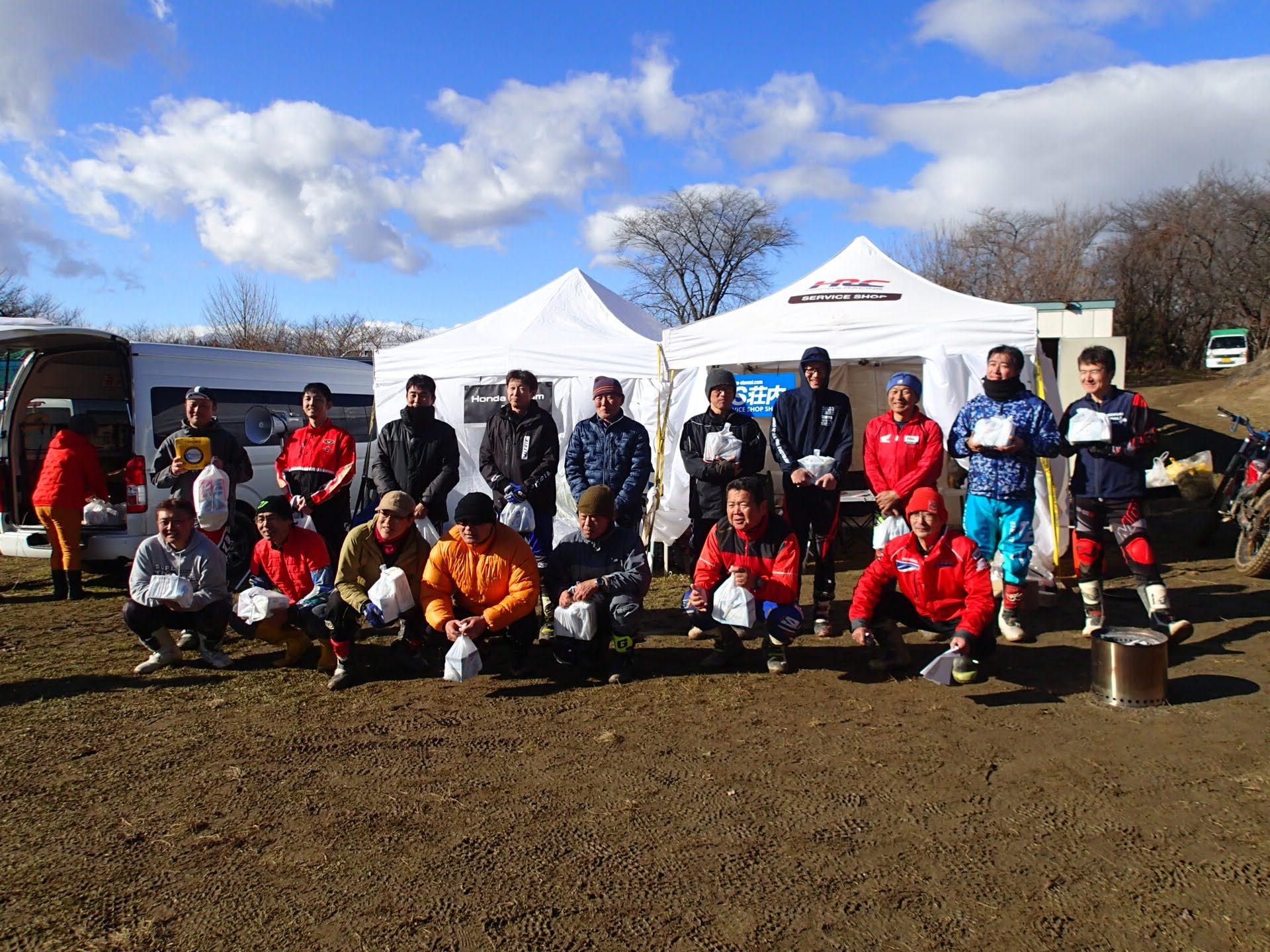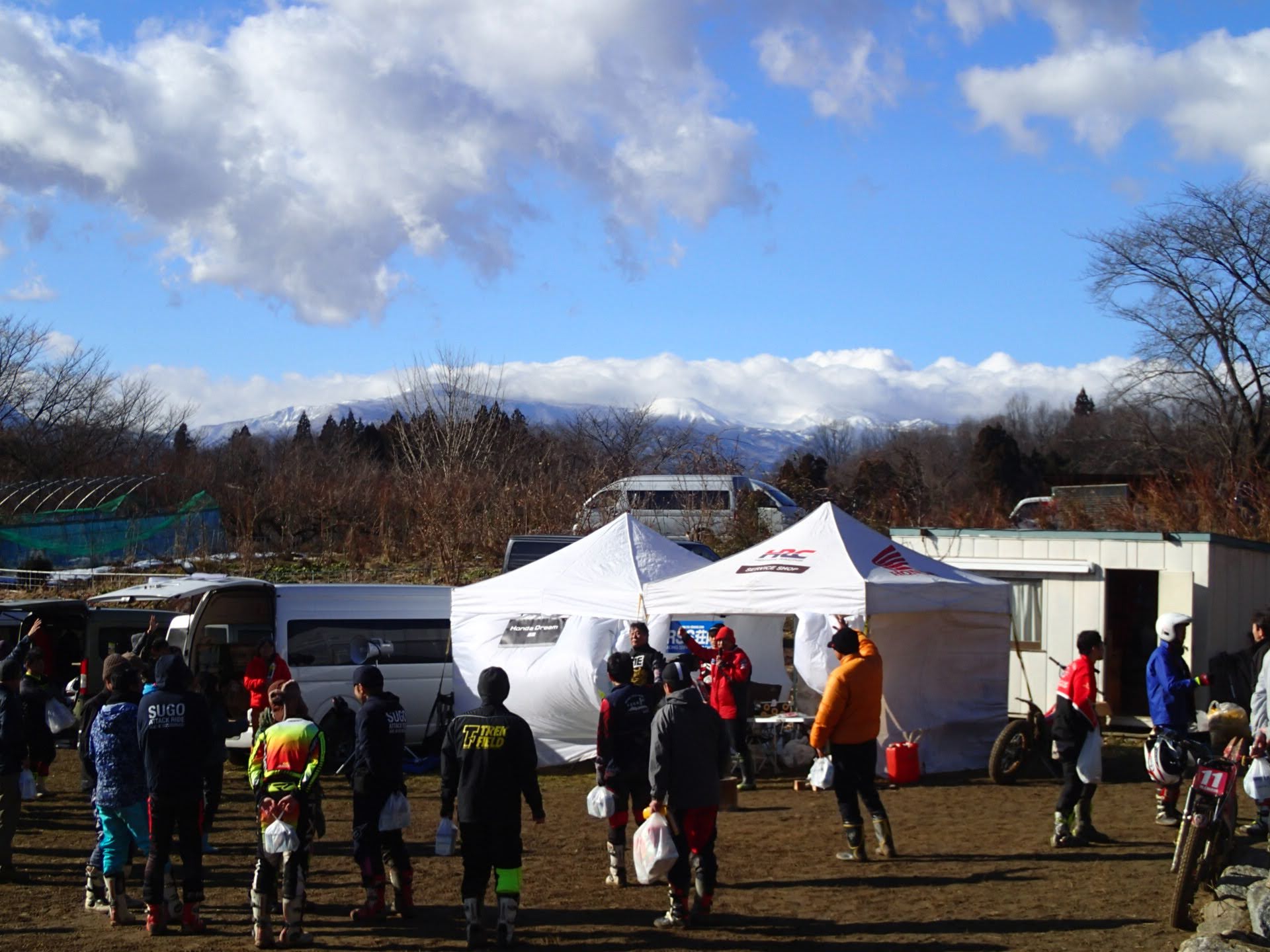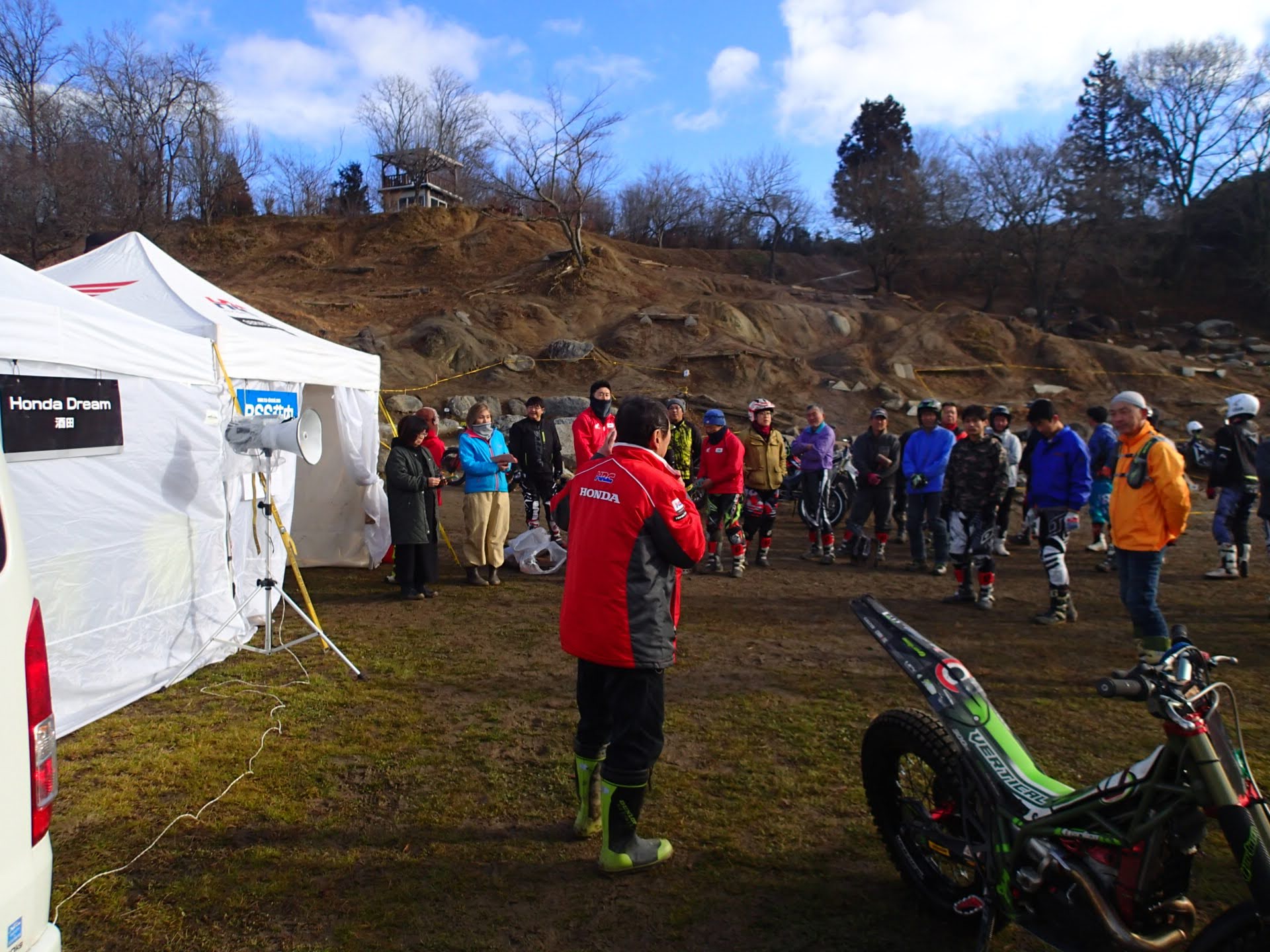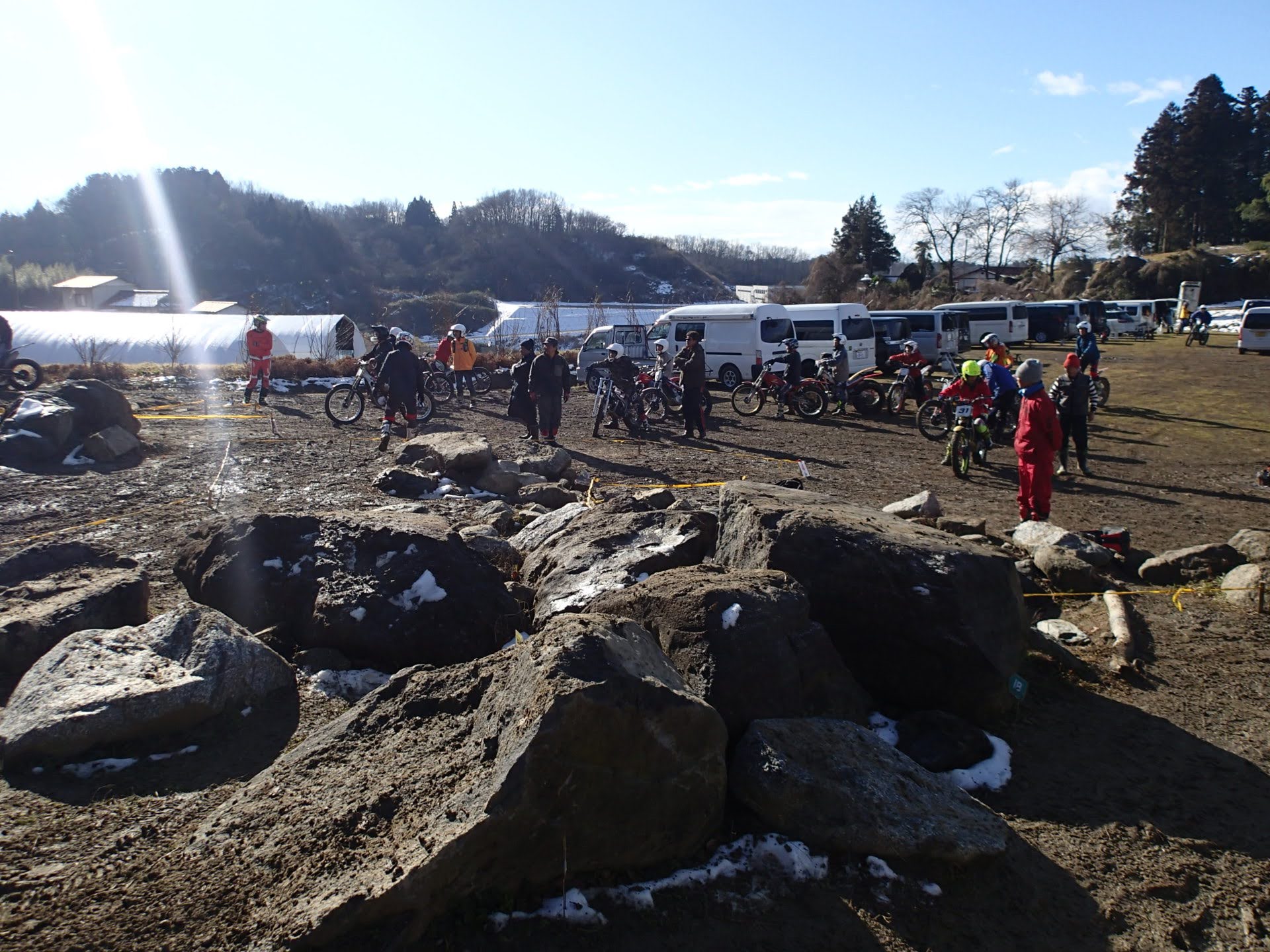 1月13日(月祭)昨日夜少し雪は降りましたが朝起きると消え天気も良く地面は少し湿っていますが、トライアル楽しめそうです。8時00分から受付が始まり9時過ぎから開会式(ミーティング)です。今年から、参加くらすを少し変更して受付です。50&ツイン、レディース、初級、中級、上級(オープン)IAの6クラスで行います。