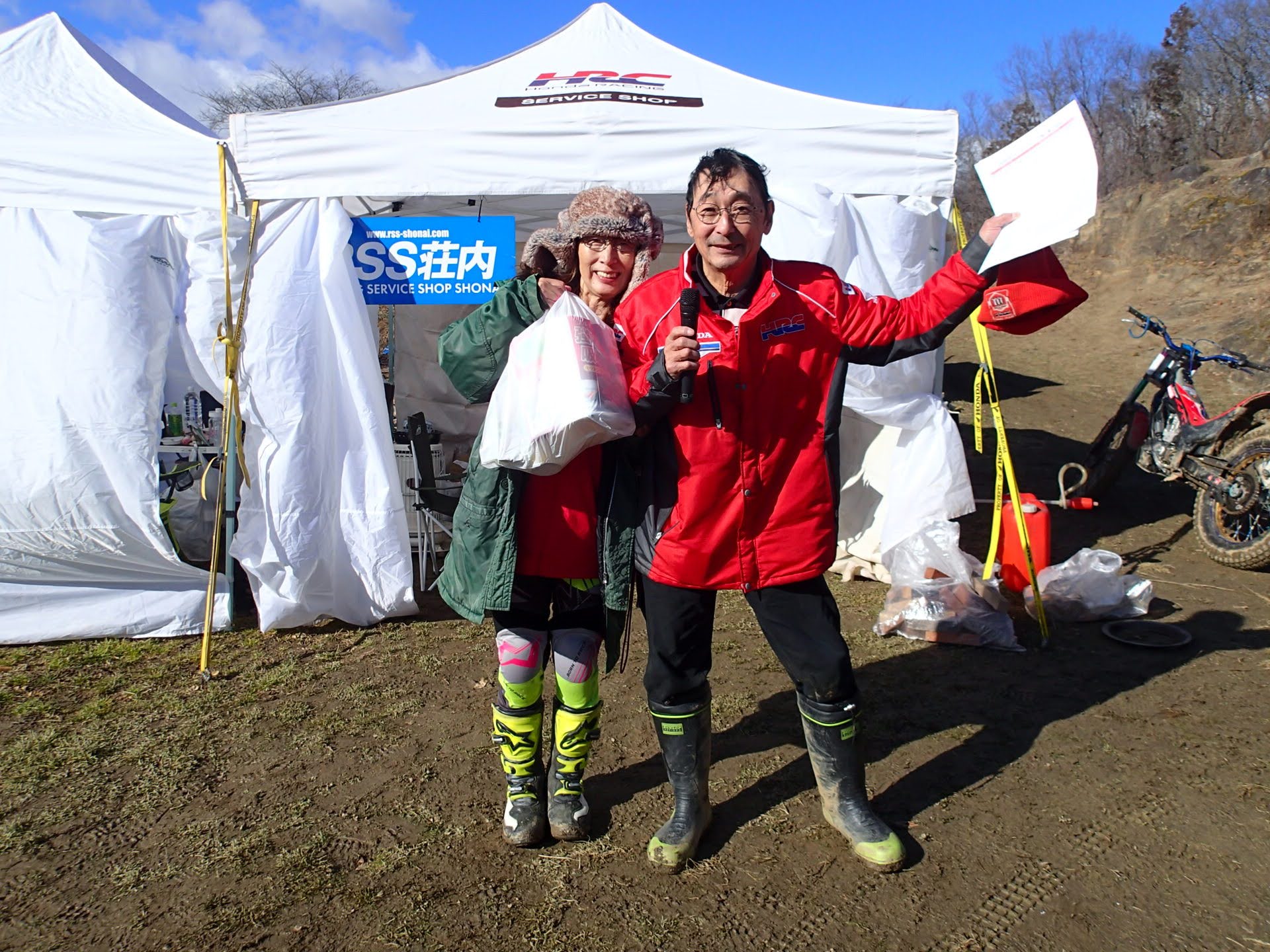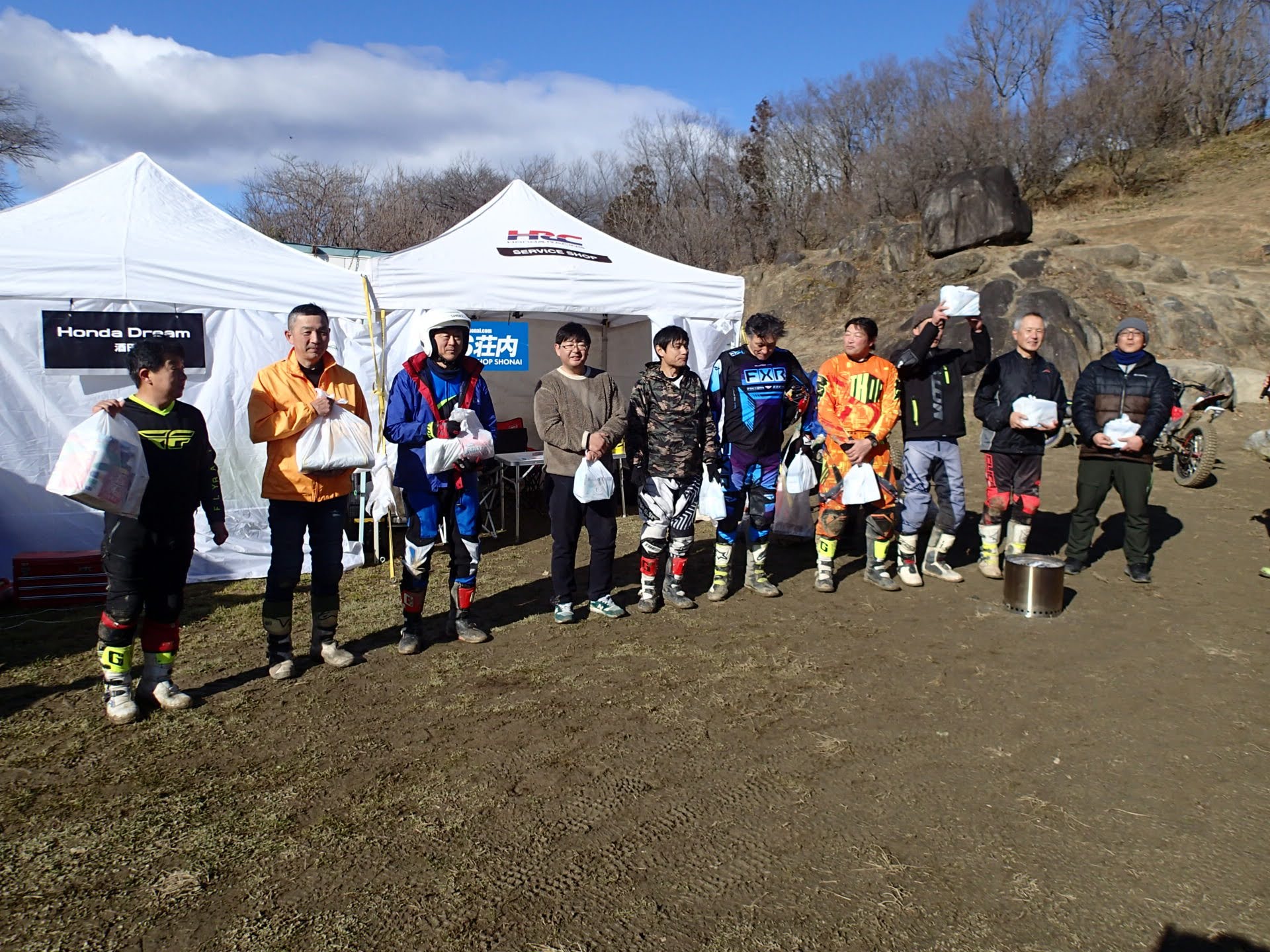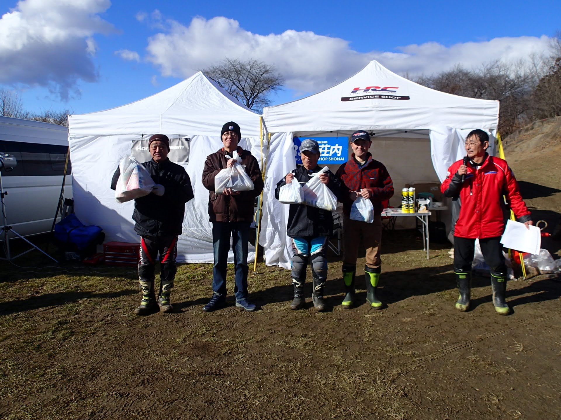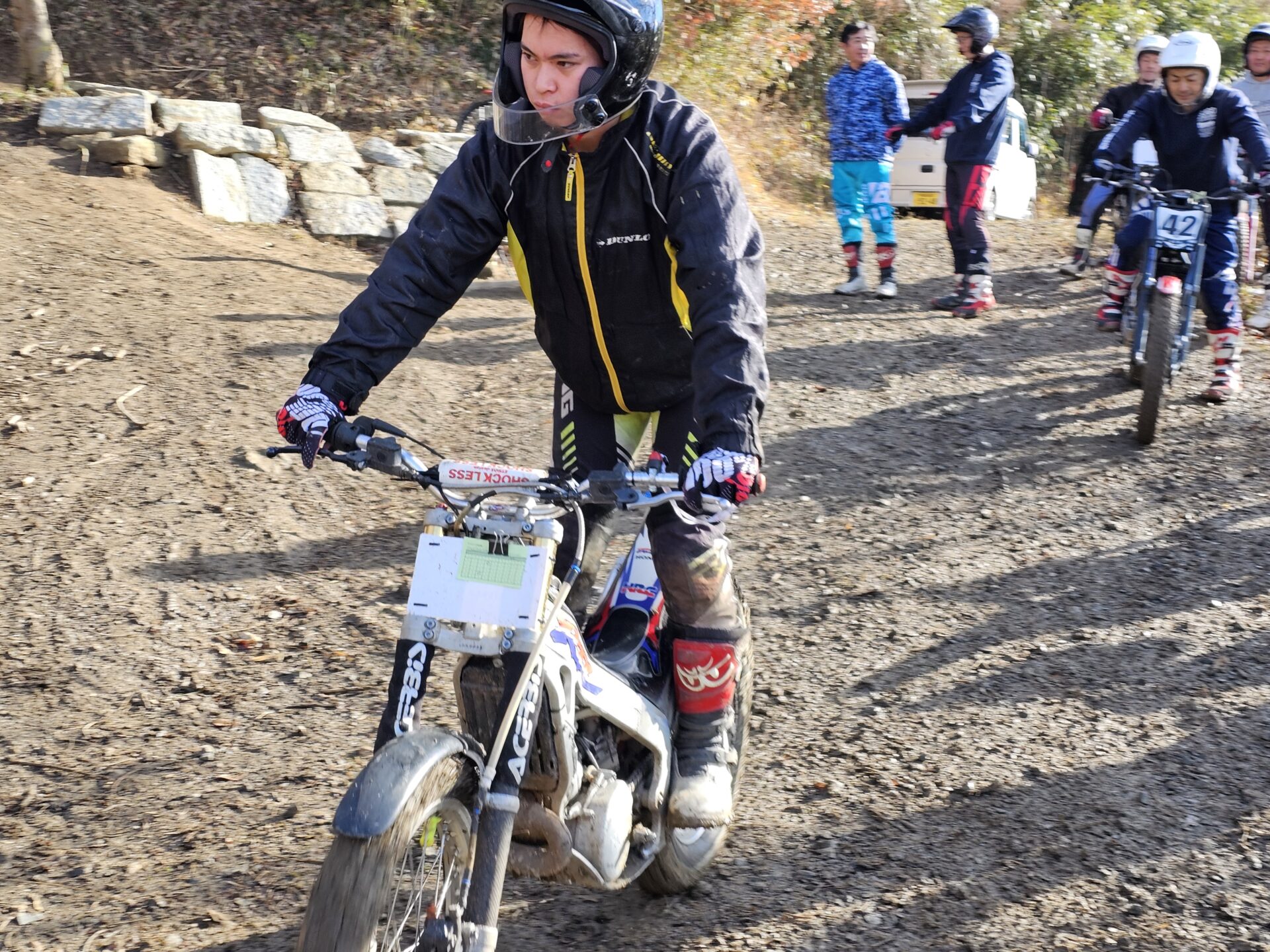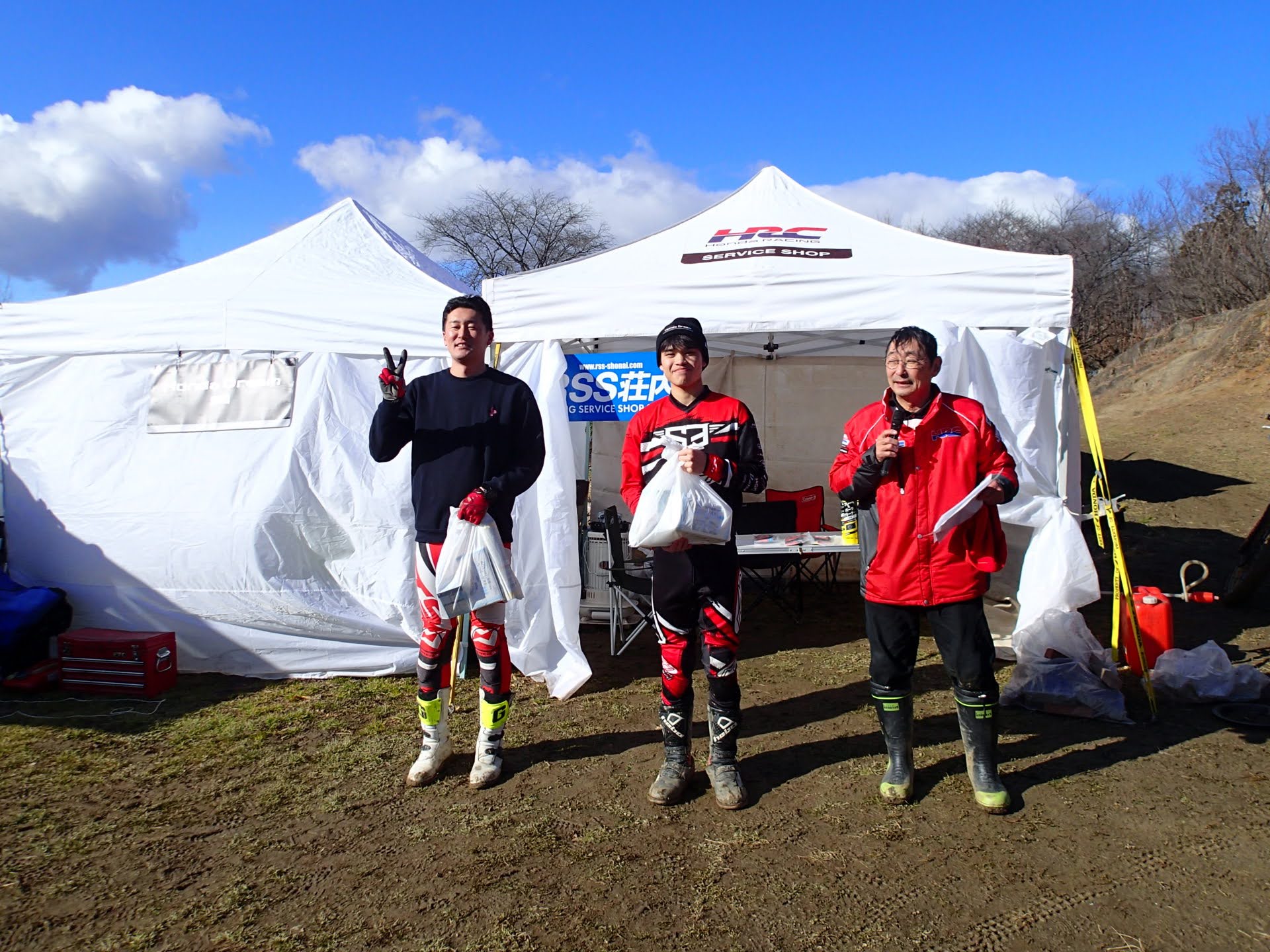 1月13日(月祭)昨日夜少し雪は降りましたが朝起きると消え天気も良く地面は少し湿っていますが、トライアル楽しめそうです。8時00分から受付が始まり9時過ぎから開会式(ミーティング)です。今年から、参加くらすを少し変更して受付です。50&ツイン、レディース、初級、中級、上級(オープン)IAの6クラスで行います。
