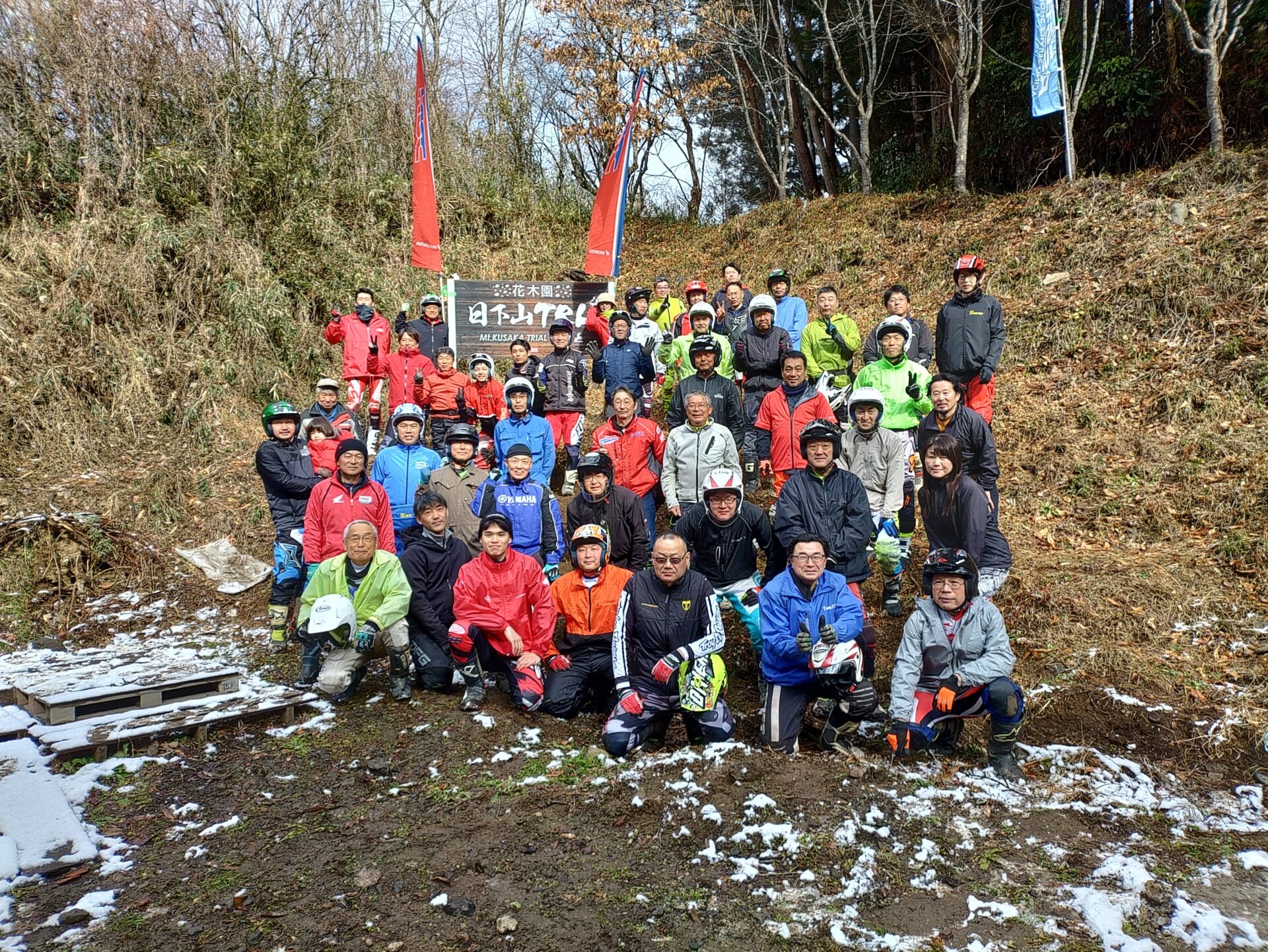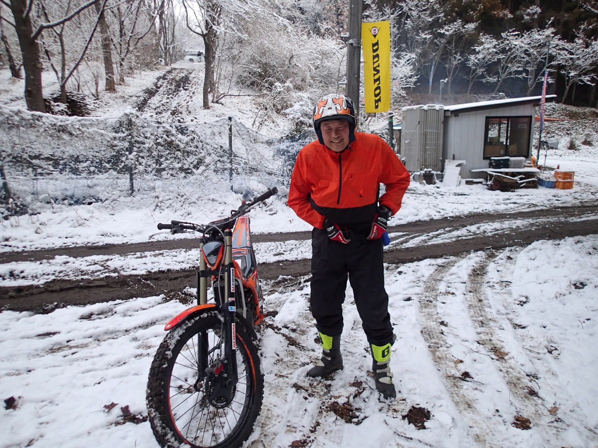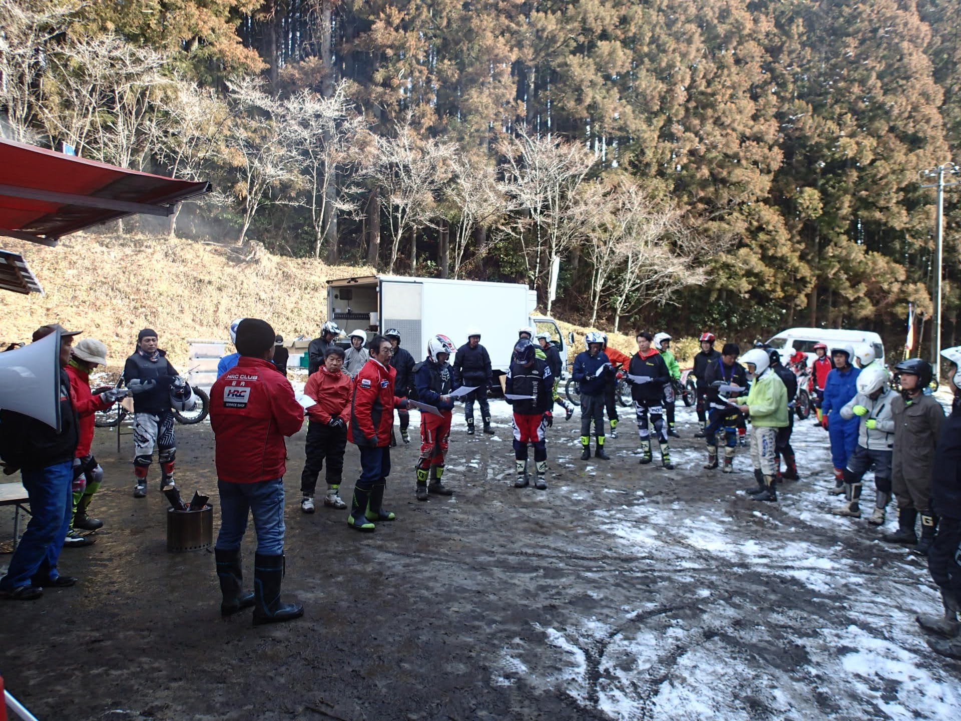 雪の中多くの皆様に参加いただきました、有難うございます。小室鍋屋さんも元気に戻ってきました。おいしかったです! 会場設営してくださった、日下山トライアルパークの日下様、セクション設定の成毛様、協力いただいた皆様有難うございます。今シーズンの元気にトライアル!!